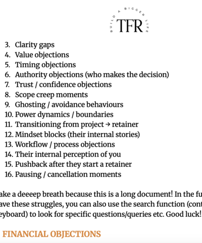 Freezing happens when you don’t know what to say. The Scenarios & Solutions Playbook gives you scripts for every awkward moment: objections, ghosting, discounts, scope creep, hesitation - all of it. You’ll know exactly how to navigate retainer conversations without spiralling.